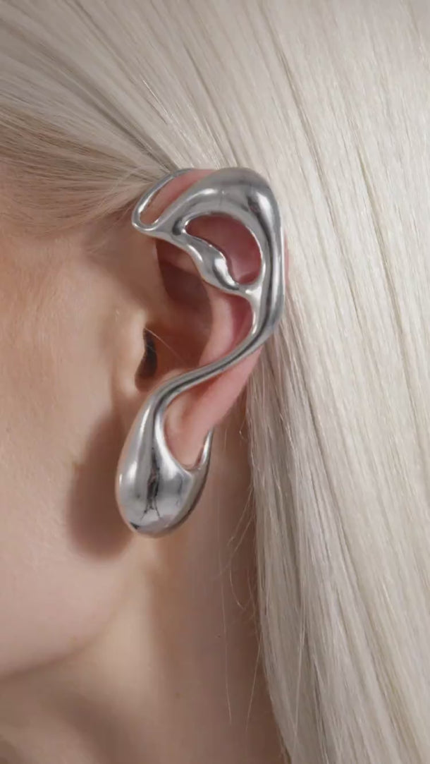 Pendiente líquido asimétrico de plata 925: joya artesanal, diseño orgánico y vanguardista, acabado espejo hipoalergénico. Eleva tu estilo con brillo contemporáneo.